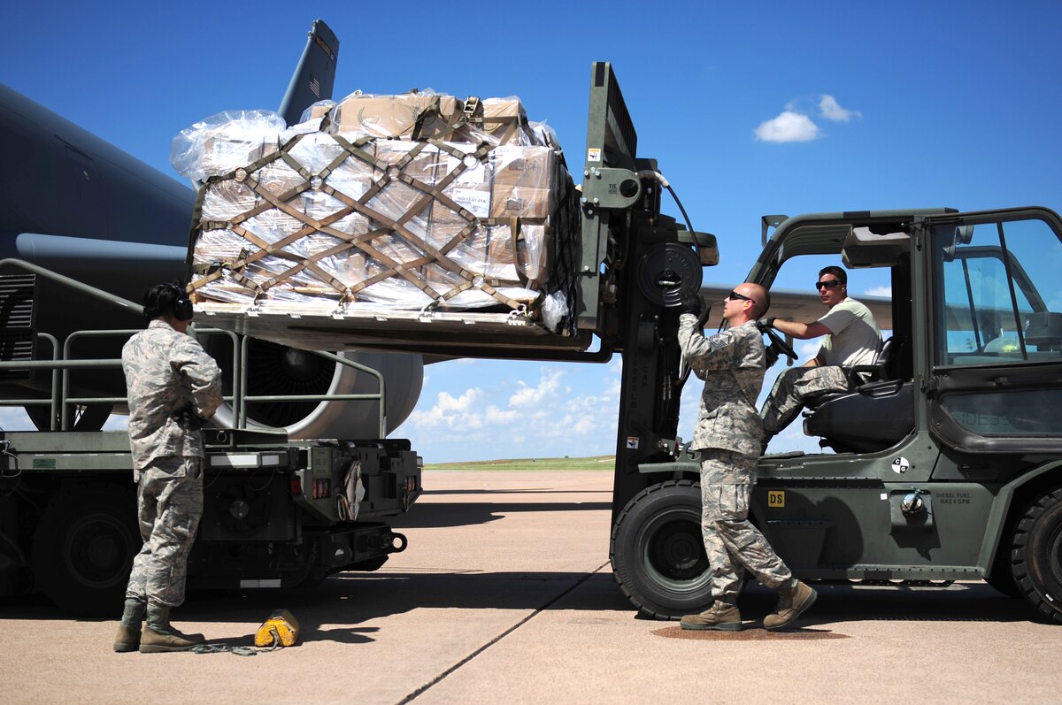 U.S. Air Force Staff Sgt. Eric Hazelwood, 7th Logistics Readiness Squadron air transportation craftsman, prepares to load pallets at Dyess Air Force Base, Texas, Sept. 20, 2016. This cargo was donated from Global Samaritan Resources based in Abilene, Texas, and the food will be transported to an air base near Erbil, Iraq, for distribution to Iraqi refugees. (U.S. Air Force photo by Airman 1st Class April Lancto)
